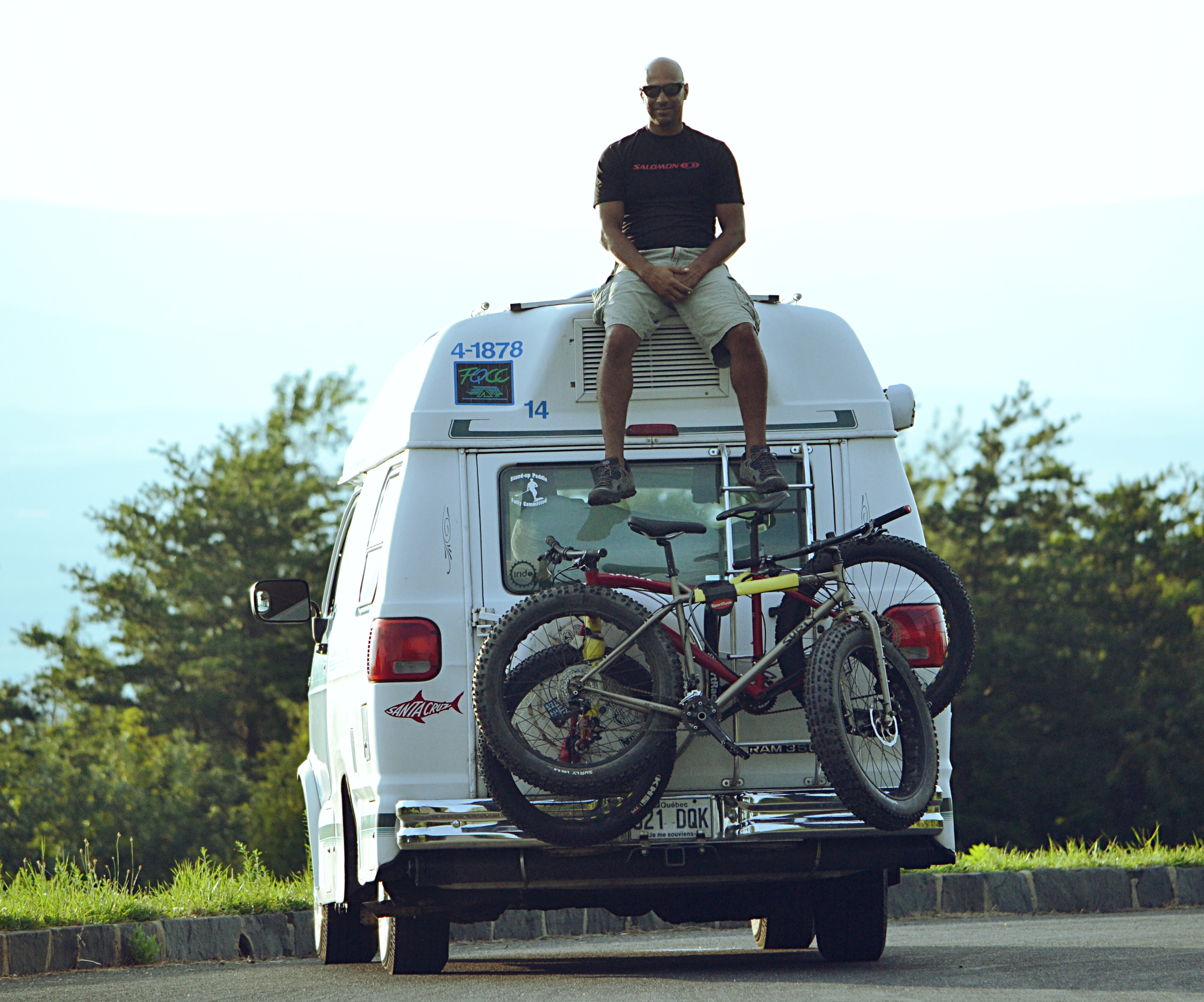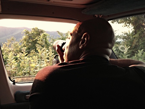 Ce soir-là, dans notre safari-photos, à l’entrée du sentier prévu pour le trek du lendemain, nous avons croisé sur notre chemin une maman ours avec sa progéniture. La maman s’est arrêtée en plein milieu de la route, devant nous, pour attendre ourson qui prenait son temps à traverser… Heureux de la rencontrer DANS l’camper !